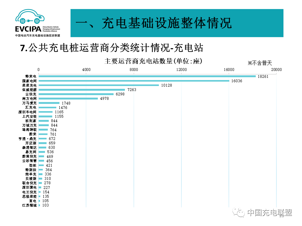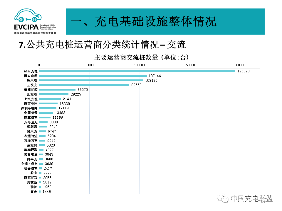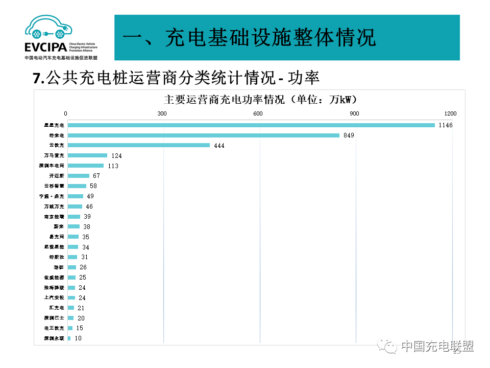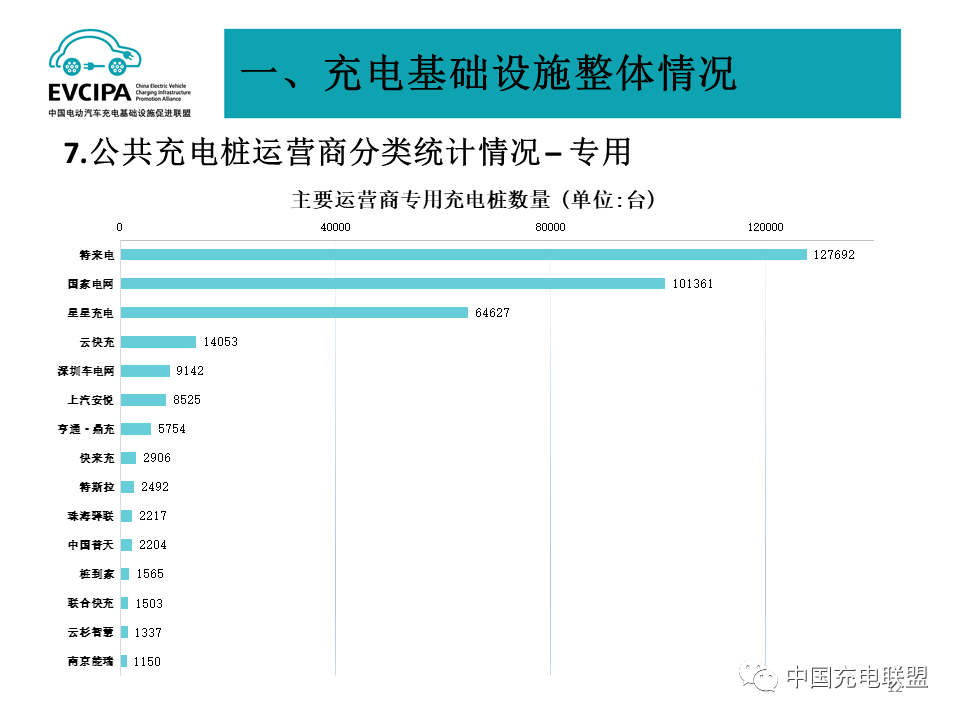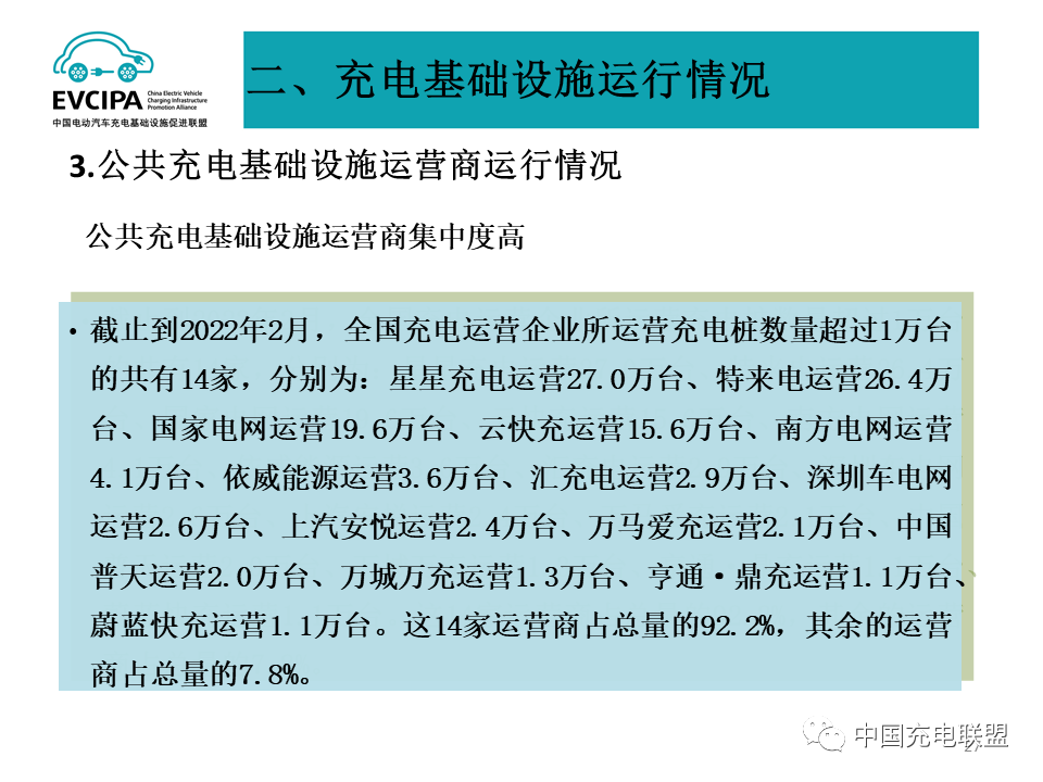 3、公共充电基础设施运营商运行情况,截止到2022年2月,全国充电运营企业所运营充电桩数量超过1万台的共有14家,分别为:星星充电运营27.0万台、特来电运营26.4万台、国家电网运营19.6万台、云快充运营15.6万台、南方电网运营4.1万台、依威能源运营3.6万台、汇充电运营2.9万台、深圳车电网运营2.6万台、上汽安悦运营2.4万台、万马爱充运营2.1万台、中国普天运营2.0万台、万城万充运营1.3万台、亨通·鼎充运营1.1万台、蔚蓝快充运营1.1万台。这14家运营商占总量的92.2%,其余的运营商占总量的7.8%。