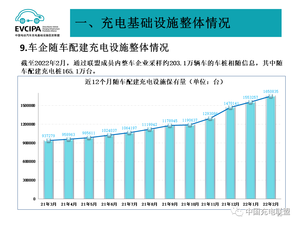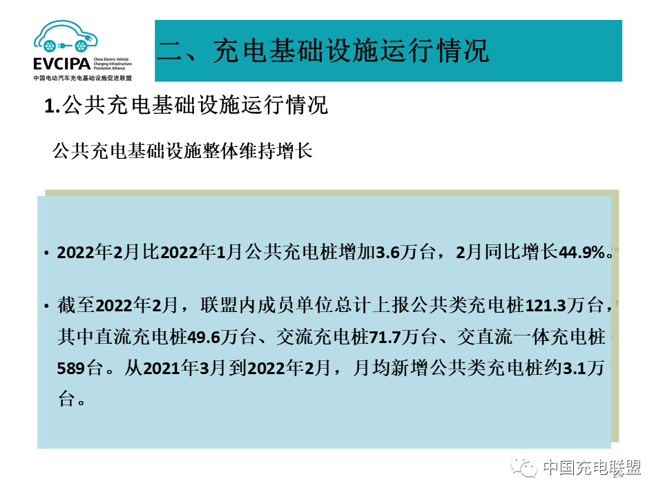 1、公共充电基础设施运行情况,2022年2月比2022年1月公共充电桩增加3.6万台,2月同比增长44.9%。截至2022年2月,联盟内成员单位总计上报公共类充电桩121.3万台,其中直流充电桩49.6万台、交流充电桩71.7万台、交直流一体充电桩589台。从2021年3月到2022年2月,月均新增公共类充电桩约3.1万台。
