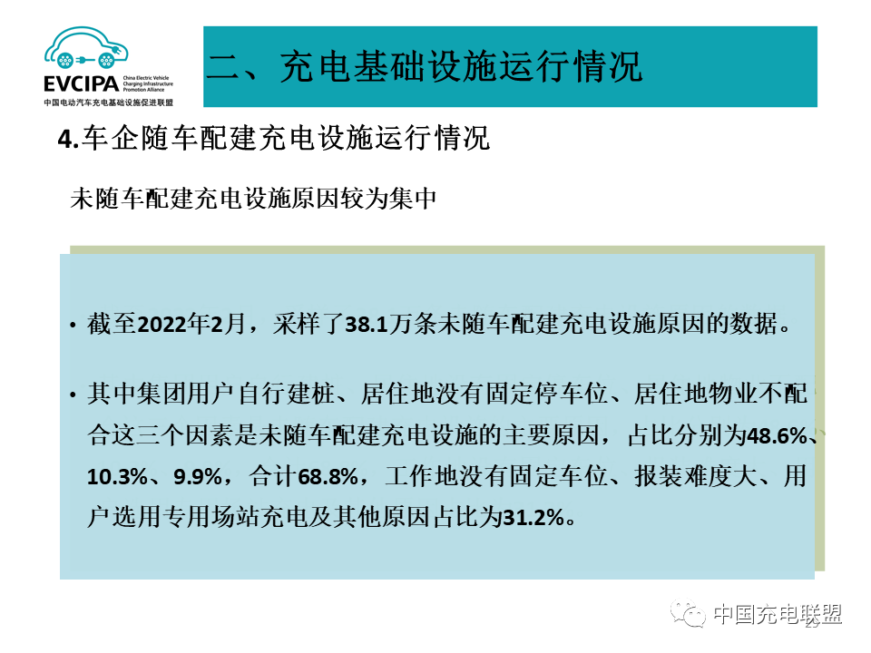 4、车企随车配建充电设施运行情况,截至2022年2月,采样了38.1万条未随车配建充电设施原因的数据。其中集团用户自行建桩、居住地没有固定停车位、居住地物业不配合这三个因素是未随车配建充电设施的主要原因,占比分别为48.6%、10.3%、9.9%,合计68.8%,工作地没有固定车位、报装难度大、用户选用专用场站充电及其他原因占比为31.2%。
