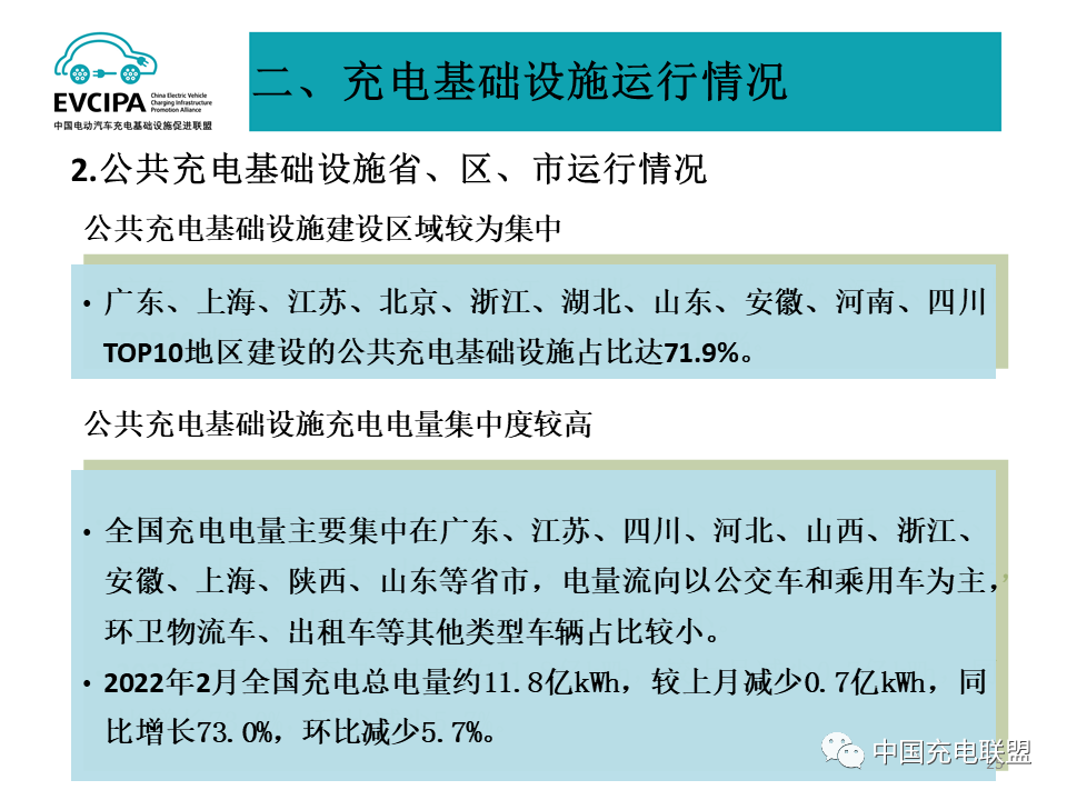 2、公共充电基础设施省、区、市运行情况,广东、上海、江苏、北京、浙江、湖北、山东、安徽、河南、四川TOP10地区建设的公共充电基础设施占比达71.9%。全国充电电量主要集中在广东、江苏、四川、河北、山西、浙江、安徽、上海、陕西、山东等省市,电量流向以公交车和乘用车为主,环卫物流车、出租车等其他类型车辆占比较小。2022年2月全国充电总电量约11.8亿kWh,较上月减少0.7亿kWh,同比增长73.0%,环比减少5.7%。