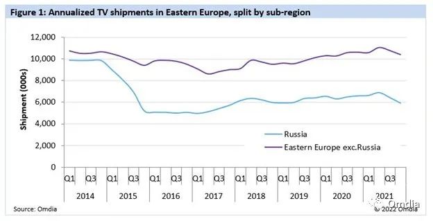 Omdia:东欧电视市场的未来如何? 随着乌克兰危机的快速恶化,我们有必要回顾一下 2014 年克里米亚事件的影响。 俄罗斯的行动可能导致一系列制裁,这将可能带来三种后果: 卢布贬值,这将会使得电视对于俄罗斯消费者来说更加昂贵。 制裁,这将导致全球的公司难以进入俄罗斯市场。 技术禁运,禁止例如半导体等关键部件的销售。 从 2014 年的制裁后果,我们可以对未来做出一定推断。俄罗斯在电视方面,完全依赖进口零组件。该国并无本地消费半导体或 LCD 面板制造能力。 制裁很可能将导致俄罗斯电视市场再次萎缩 图中所示为 2014 年制裁的后果:俄罗斯市场在 2015 年缩水大约两百万台(约 50%)。 之后,市场虽然缓慢恢复,但从未恢复到 2014 年的水平。市场的恢复,一部分是通过新供应链模式实现的。俄罗斯消费者通过全球速卖通(AliExpress)直接从中国购买产品,AliExpress 整合货物,然后销往俄罗斯。降低零售利润,也能够抵消货币贬值带来的一部分影响。 展望未来,有多项因素与几年前雷同: 卢布对美元已经跌了 10%,而美元是半导体和 LCD 面板等电子零组件的定价货币,这会导致俄罗斯市场的电视机零售价格上涨。 金融制裁很可能导致全球各大电视品牌难以在俄罗斯市场开展业务。对于寻找机会的中国厂商来说,可能存在较好的进入机会。 还有一个新的影响因素是,由于美国政府对于华为的禁运影响,向俄罗斯市场销售半导体产品将变得困难。 例如直接通过 AliExpress 的销售手段已经成为常态。因此,这次制裁对于需求的损害,可能会更为严重。但中国政府实施制裁的力度尚有不确定,因此俄罗斯电视市场供应链或许会有利于中国品牌。 来自: Omdia 更多阅读:Omdia:消费者仍对 8K 持怀疑态度Omdia:线性电视收视率继续下降Omdia:2020年全球传统付费电视订阅用户数量减少了800万以上Omdia :2022年Q1中国电视机厂商面板采购计划共计2090万片 同比下降3%Omdia:2022年4月越来越多的品牌商考虑为其 VR 设备配备 OLEDoS 显示面板Omdia:2022年4月越来越多的品牌商考虑为其 VR 设备配备 OLEDoS 显示面板显示面板行业2021年总结及2022年展望(上):大尺寸显示面板Omdia:2022 年 7 月大尺寸显示面板出货量月同比下降 10%Omdia:2022年4月TFT LCD 面板出货量环仅有 1 亿 9500 万片 同比下降 15%Omdia:2022年第二季度全球电视出货为4353万台 同比下降9.0%Omdia:关税变化或将推动韩系电视品牌在美国市场份额的上升Omdia:线性电视仍是2019年的主要观看形式Omdia:2019年线性电视占美国电视收视的63% 长视频的收视率占16%Omdia:2023年免费广告支持流媒体电视(FAST)频道产生63亿美元收入Omdia:“未来两年4K是市场营销者的梦想”