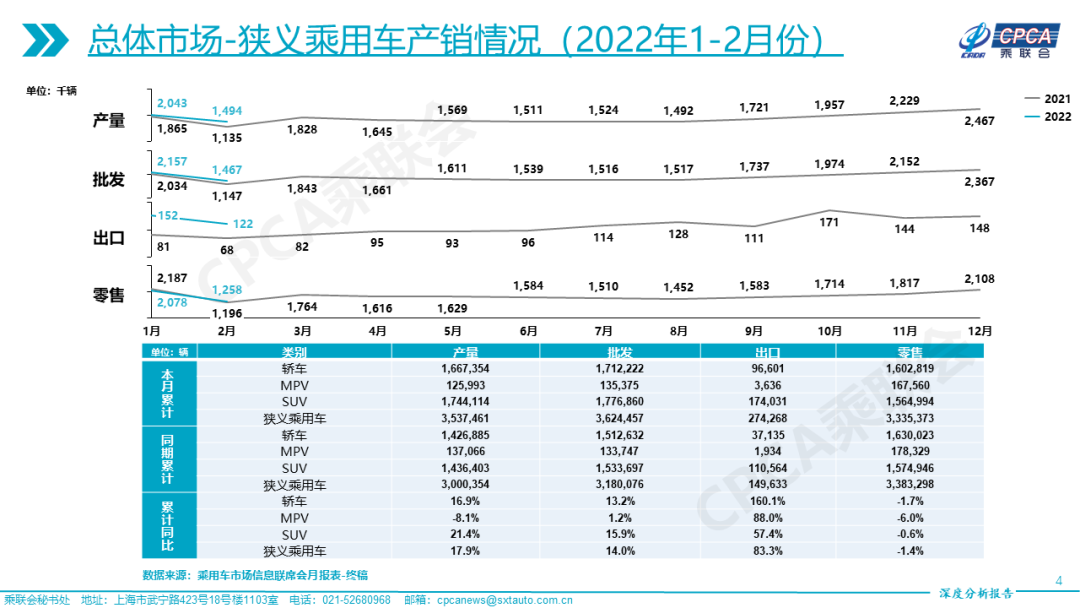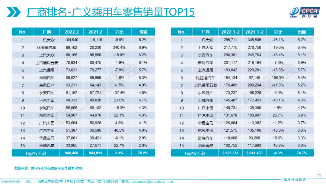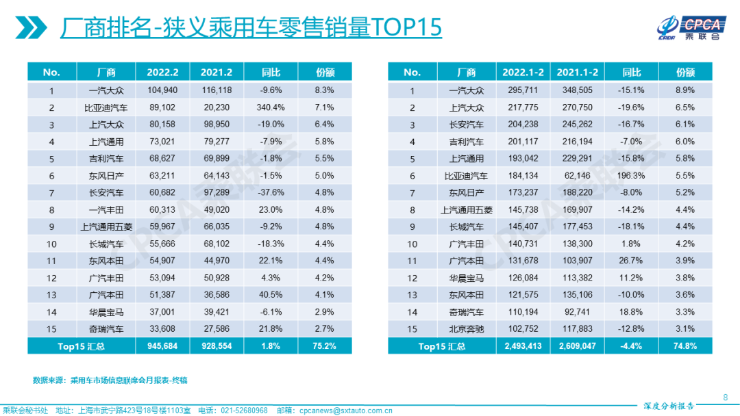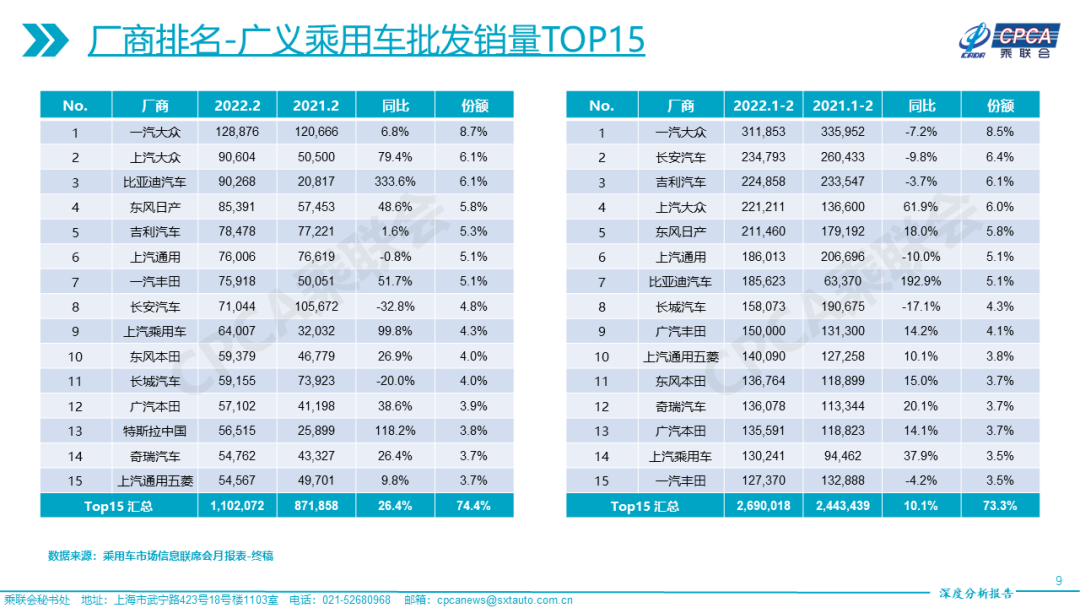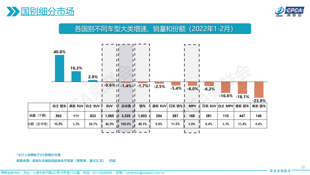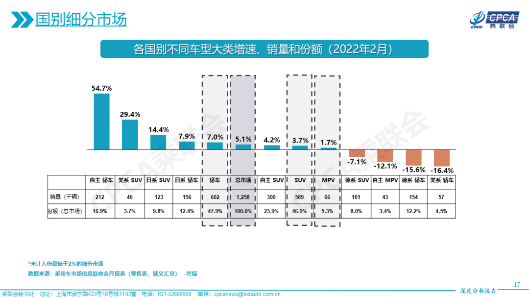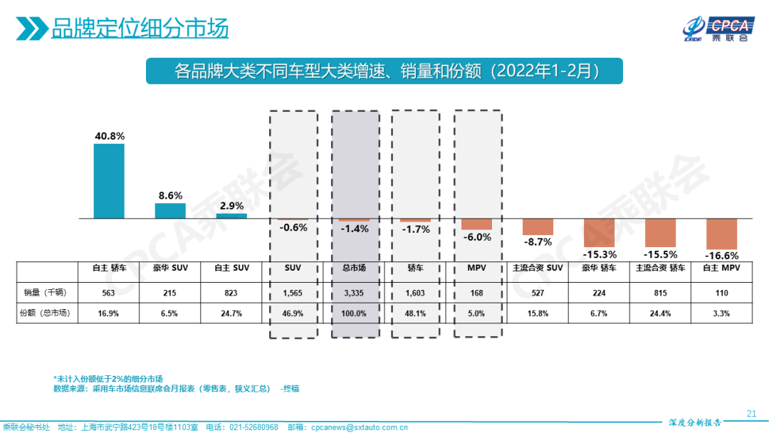 - 各品牌大类下不同车型大类增速、销量和份额——2022年2月及累计