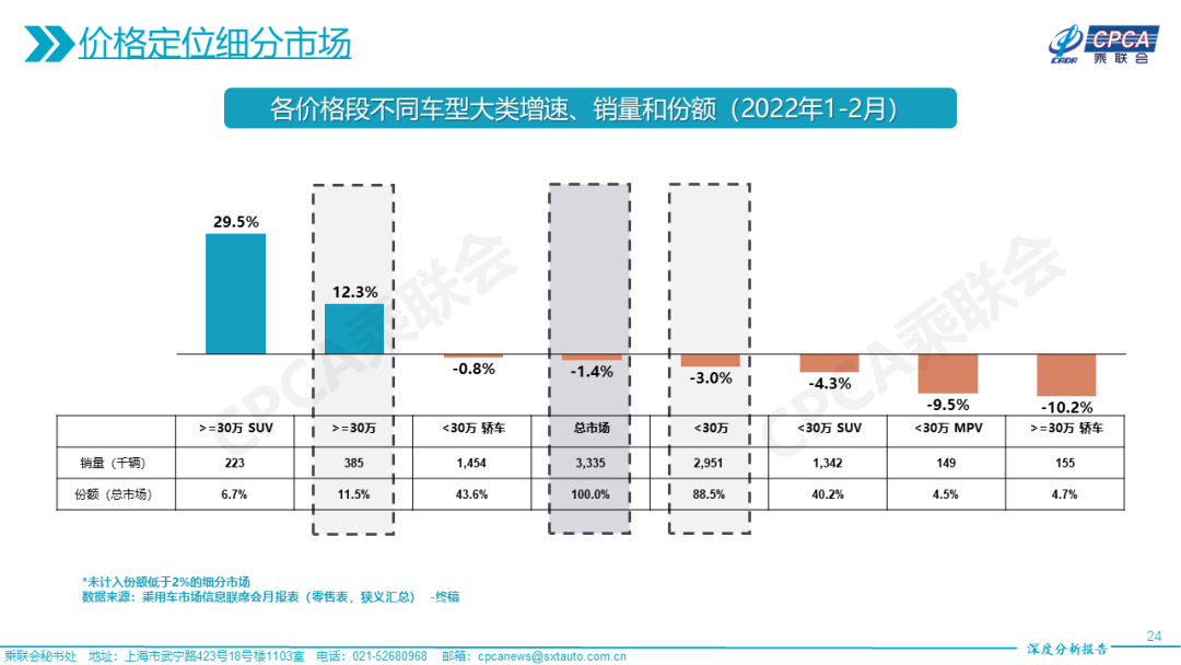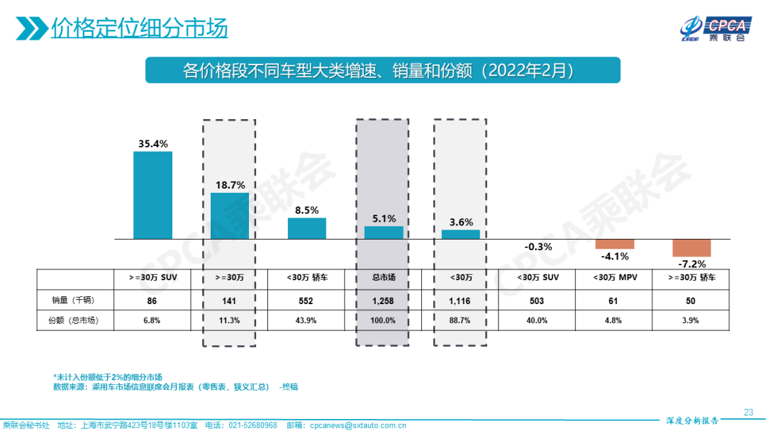 - 各价格段不同车型大类增速、销量和份额——2022年2月及累计