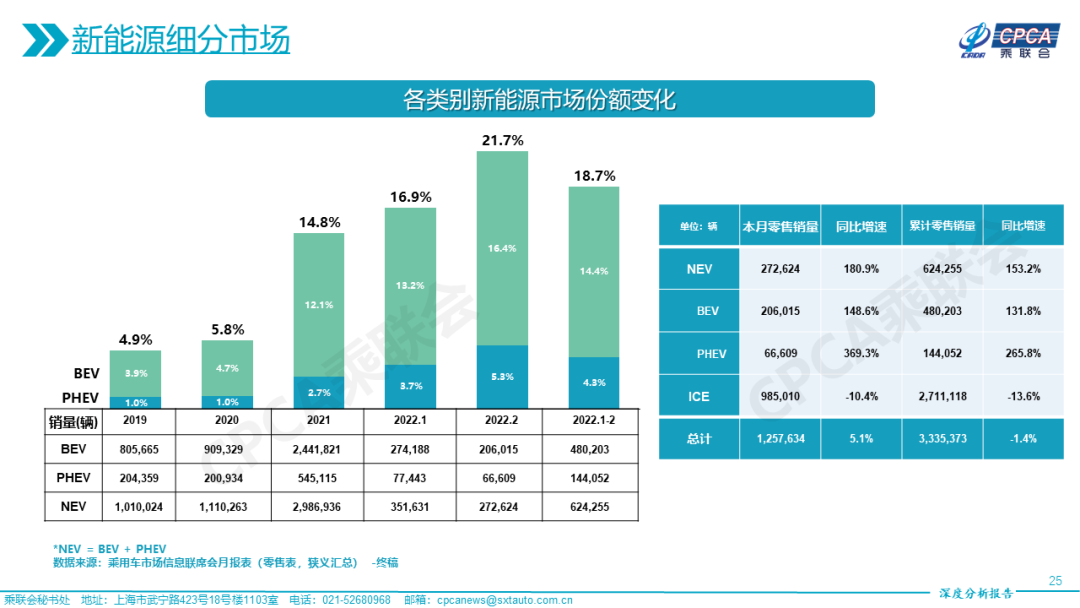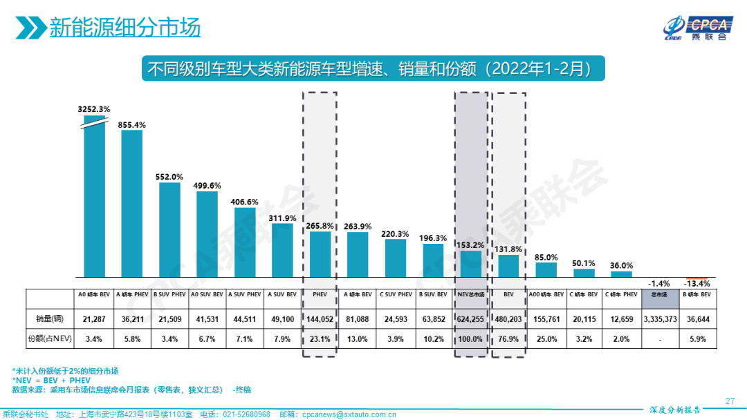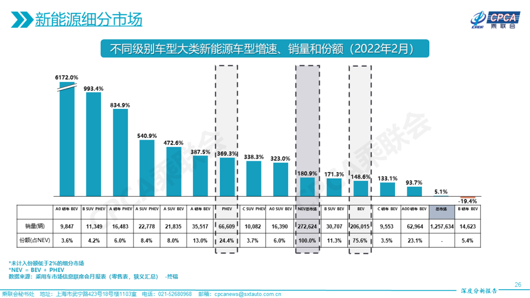 - 不同级别车型大类新能源车型增速、销量和份额——2022年2月及累计