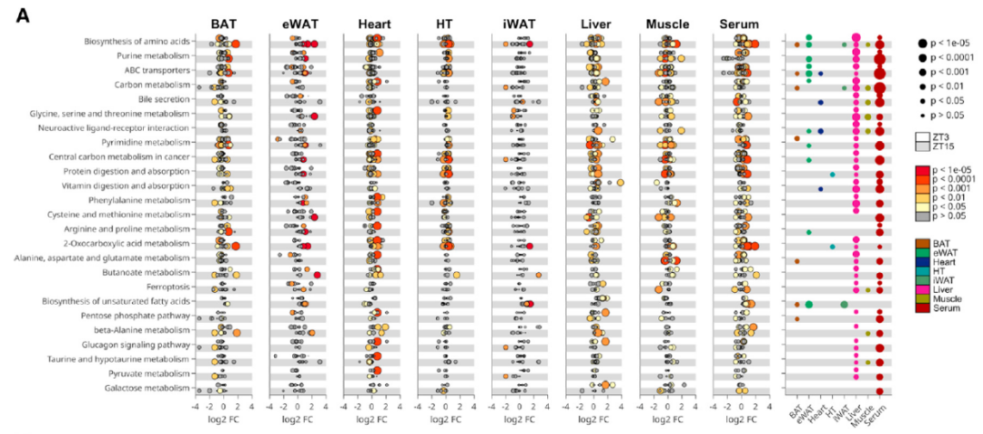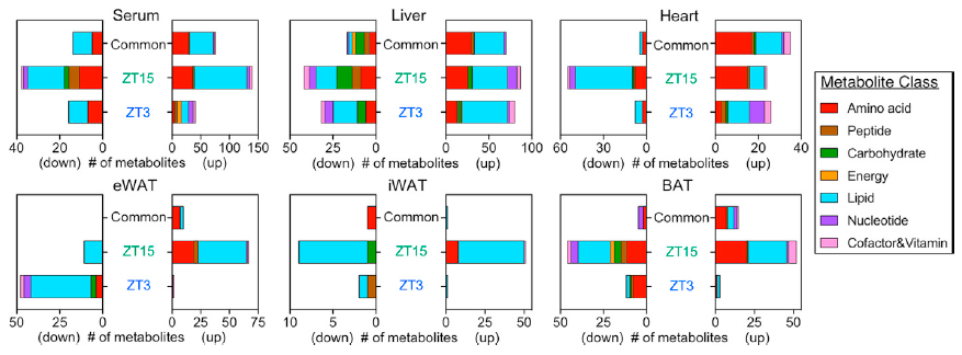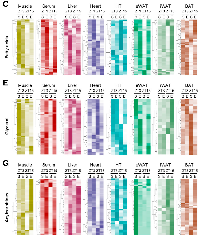 肝脏中,清晨和傍晚分别影响了 129 和 143 种代谢物,有 101 种代谢物在两者中都发生了变化。eWAT 中,代谢物通常在清晨运动后减少,但在傍晚运动之后会增加。因此,他们认为运动对代谢物的影响具有时间依赖性和组织特异性。