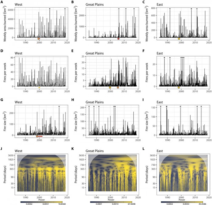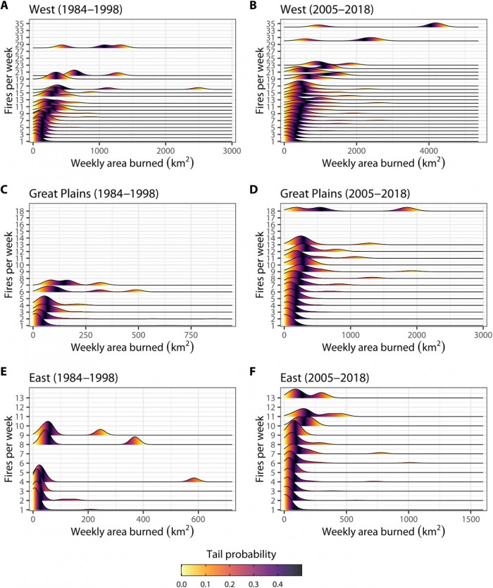 在频率方面,他们发现西部和东部的火灾频率增加了一倍,而大平原的火灾频率在研究的几年里增加了四倍。此外,他们说,每年烧毁的土地面积从西部的中间地带1552平方英里增加到5502平方英里,从东部的465平方英里增加到1295平方英里。