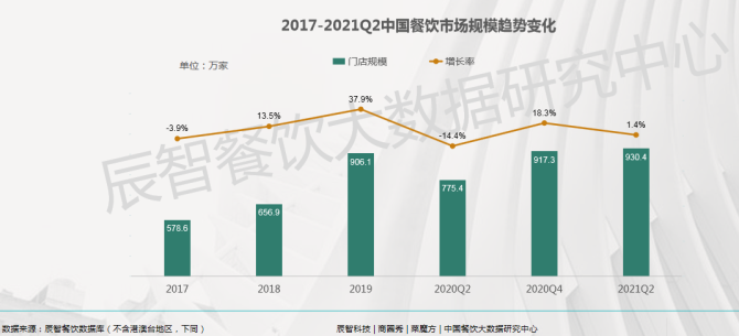 2021年中国餐饮门店总规模再创新高,突破930万家,但增速明显放缓,市场处于“增量”向“增质”转变的过渡期。