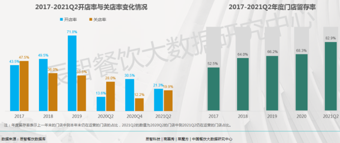进入2021年,餐饮业的开关店率比较均衡,开店率略高于关店率。经过疫情锻炼,中国餐饮企业的抗风险能力明显提升,最近一年门店留存率超80%,明显高于之前几年。