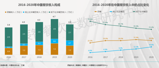 从2016年至2020年,团餐、线上社会餐饮和线下社会餐饮的结构出现了明显的趋势性变化,特别是2020年的疫情对团餐与线下的社会餐饮业都造成了冲击,反而对线上外卖业的发展起到一定的促进作用,餐饮线上化趋势明显。