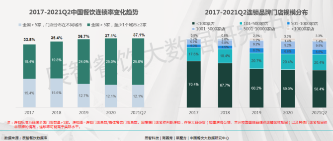 从整个数据来看,近5年来,中国餐饮连锁率持续走高。目前,我国餐饮门店中约37%为连锁品牌门店。