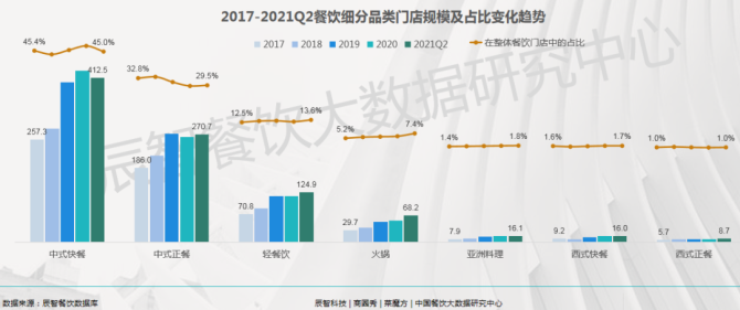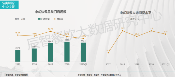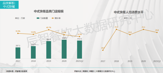 中式快餐牢牢占据中国餐饮市场第一赛道,门店数占比达45%,在2020年疫情期间逆势增长,但进入2021年首次出现负增长。