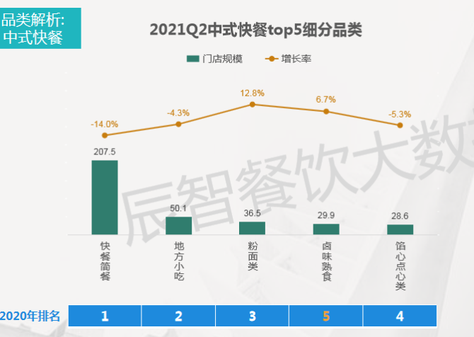 2021年Q2中式快餐TOP5细分品类分别为快餐简餐、地方小吃、粉面类、卤味熟食,以及馅心点心类。