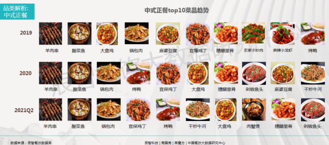 在中式正餐菜品中,羊肉串、酸菜鱼近三年来始终占据榜单前两位,拥有较高的国民喜爱度;肉蟹煲首次入围TOP10榜单。