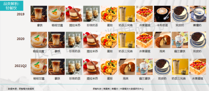 轻餐饮点选最多的饮品是杨枝甘露和拿铁;众多饮品店将杨枝甘露纳入产品线,杨枝甘露产品近两年热度攀升。