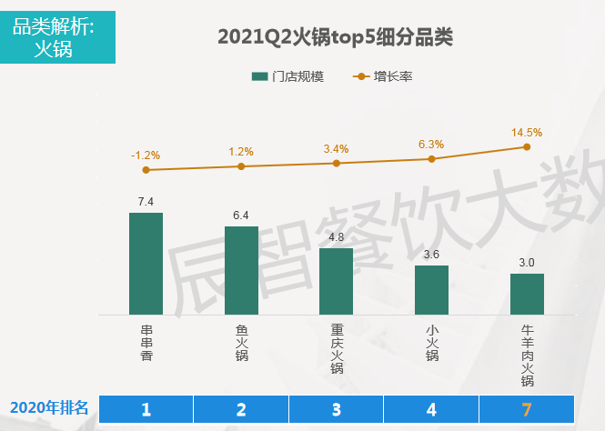 火锅品类中,门店数量最多的串串香火锅,其门店规模有小幅度下滑;牛羊肉火锅增速明显,超越四川火锅跻身火锅TOP 5的细分品类。