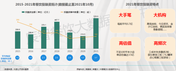 2021年餐饮投融资呈现“二大二高”特点:大手笔、大机构、高估值与高频次。