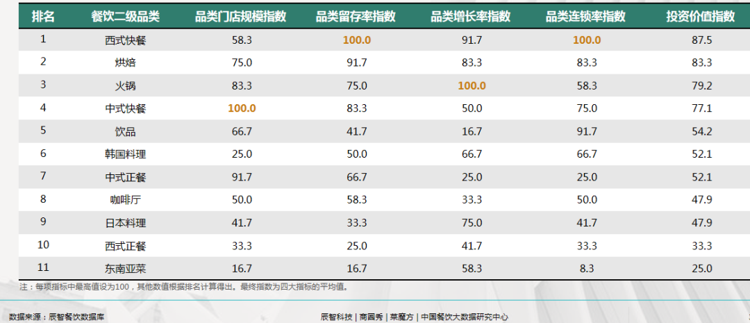 6、二级品类投资价值排名:快餐、烘焙与火锅是投资价值最高的餐饮品类