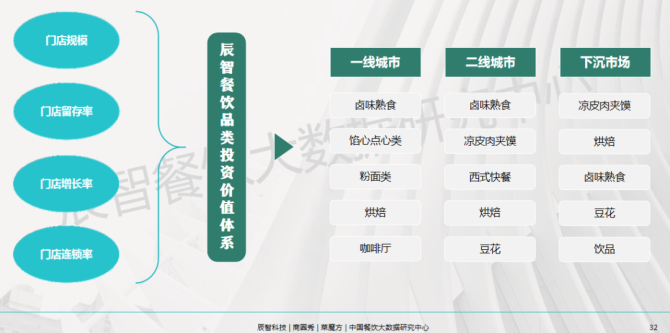 餐饮与资本的关系愈加紧密。辰智科技从门店、赛道、品类规模、品类留存率以及门店增长率、连锁率等维度提出了餐饮品类投资价值体系。不同的线级城市有着不同的投资热点,比如在一线城市,卤味熟食、点心类、馅心、粉面类、咖啡最具投资价值;二线城市中,卤味、凉皮、肉夹馍、中式快餐包括烘焙、豆花等最具投资价值;在下沉市场中,凉皮、肉夹馍、烘焙、卤味、熟食、豆花以及饮品是最具投资价值。