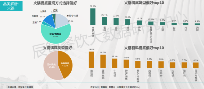在锅底方面,消费者更偏爱重口味涮菜锅底、养生清淡有料锅底,目前鸳鸯锅占据主导地位,且有料锅底更受欢迎。涮菜用锅底消费者口味较重,而有料锅底口味较为清淡适合养生。