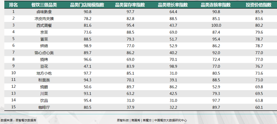 卤味熟食、凉皮肉夹馍、西式简餐(如汉堡、三明治、轻食沙拉等)、北京烤鸭、冒菜与烘焙是最具投资价值的餐饮细分品类