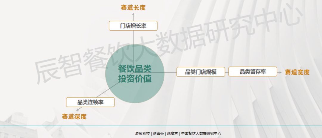 一个赛道是否有投资价值,取决于赛道的宽度、长度与深度。宽度代表赛道的容纳空间,即市场的容量;广度表示赛道的成长空间,即市场的增长潜力;而深度则代表赛道的成长逻辑,即市场成长的驱动因素。辰智选取门店规模与留存率代表宽度,门店增长率代表广度,门店连锁率代表深度,综合这4个指标构建辰智餐饮投资价值体系。