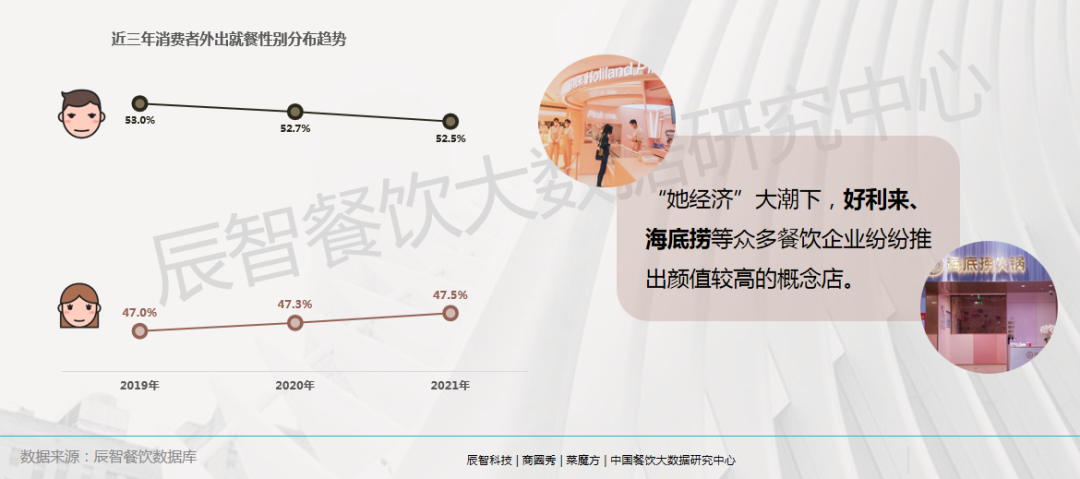 “她经济”崛起,超八成餐饮消费由女性决定。 整体外出就餐的消费者性别比例分布较为平均,近三年女性比例逐年增加。根据国外研究表明,女性对餐饮消费决策的影响占比为85%,因此女性消费意愿对餐饮消费市场的影响不容忽视。