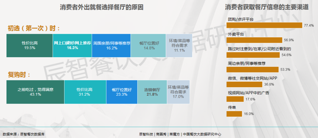 消费者初选餐厅时更看重价位与口碑,网络是信息获取第一渠道。 消费者初选餐厅时最看重性价比与口碑推荐,特别是会去专业餐饮平台(如美团、大众点评等)查看网上的评价或推荐,加之短视频与直播等也成为当地年轻人最常使用的获取信息的工具,餐饮企业应有效运用这些新媒体工具,精准触达消费者。除此之外,连锁餐厅也成为复购的一项重要考虑因素。