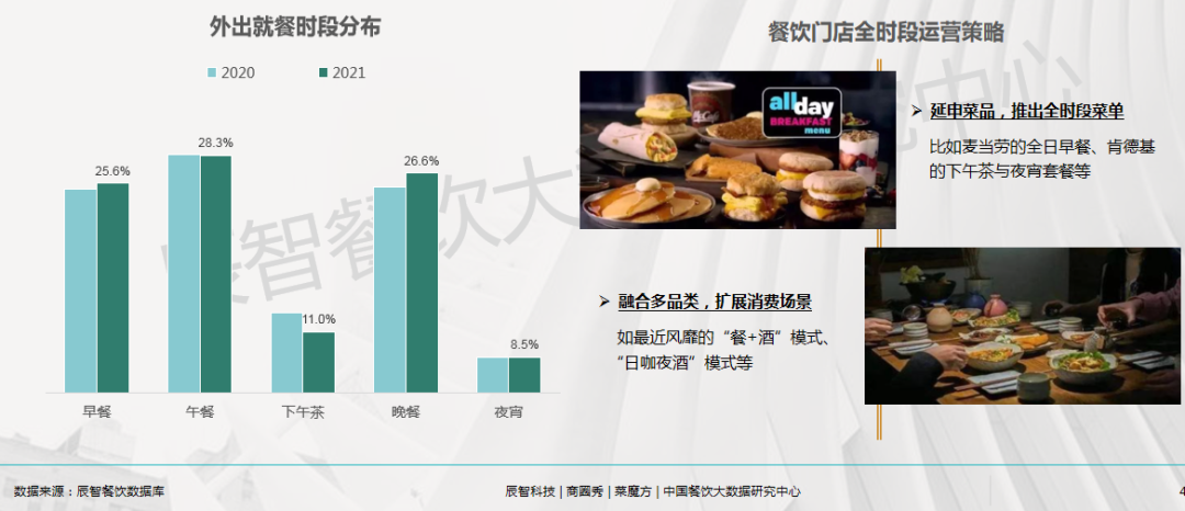 早餐与夜间消费需求增多,推动餐饮门店开展全时段运营。 总体而言,三餐时段是一天内的就餐高峰,早餐与夜间消费需求在增多,全时段运营成为越来越多餐饮企业的选择。