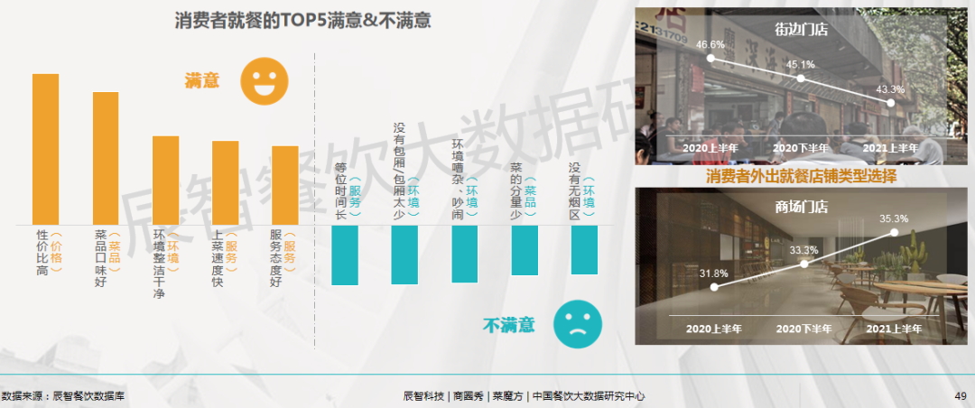 后疫情时期,就餐环境汇聚最多不满,商场店热度回升。 后疫情时期,除性价比与口味外,整洁的环境会让消费者更为满意;且不满也更多聚焦环境,top5不满意中有3个是环境因素,餐饮门店升级已成为大势所趋,而商场店也因为就餐环境相对较佳的优势实现了热度回升。