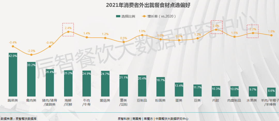 蔬菜及禽肉食材成为消费者心头好,内脏类成为食材新贵。 消费者外出就餐食材丰富多样,但整体蔬菜类、禽肉类、猪肉类是消费者最常点选的三大类食材。与2020年相比,内脏类、海鲜/河鲜及水果食材的消费者点选频率有相对较大幅度的增长。