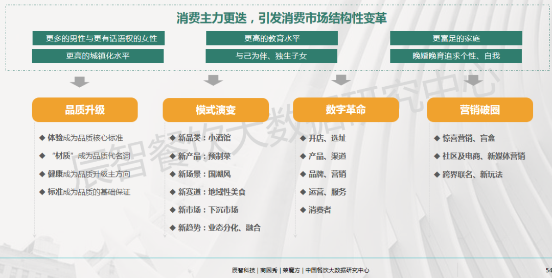 从80后到90后,中国消费市场迎来新主流消费人群。疫情按下了90后“抢班夺权”的快进键,也加快了品牌更迭的进度。同时,中 国“00后一代”也可能提前引领全球消费。 消费主力更迭,引发消费市场结构性变革。 餐饮业随之表现出以下变革: