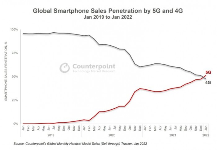 中国的5G智能手机使用率是全球最高的,2022年1月的渗透率为84%。Counterpoint认为这要归功于中国电信运营商的推动,以及制造商向消费者发布具有价格竞争力的5G智能手机。