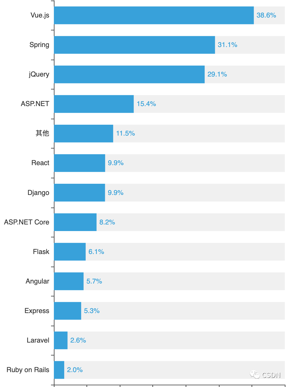 Web 框架方面,Vue.js 依旧稳居第一,但值得注意的是:Vue.js 使用者从去年不到 30% 的占比已增至 38.6%。可见随着 Vue 3.0 的普及,程序员圈中愈发流行用 Vue.js 进行 Web 开发。