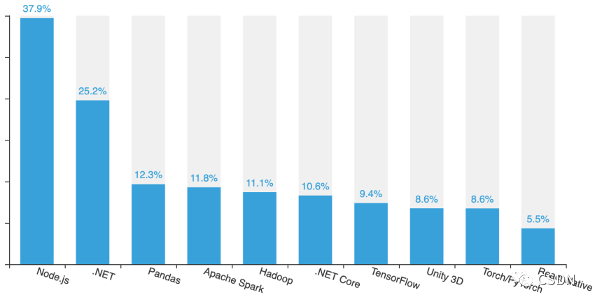 开源吞噬世界,与此同时开源工具正在吞噬开发者。数据显示,过去一年有 37.9% 的开发者在使用开源技术框架 Node.js,而作为谷歌开源的 TensorFlow 和 Facebook(现 Meta)主力支持的PyTorch,这二者的使用占比也在缓慢上升。