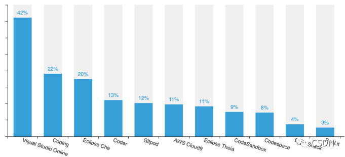 在此趋势下,许多开发者开始在日常开发中尝试用云 IDE 作为补充,其中 43% 的人使用 Visual Studio Online。遗憾的是,也因为云 IDE 过于“新”,超过六成开发者表示没用过云 IDE。
