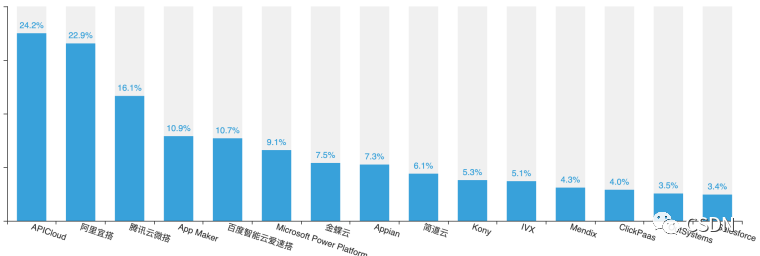 低代码也是近些年的热词之一,不过与其话题性相反的是,仅有 3 成左右的开发者表示曾在工作中使用过低代码开发平台:APICloud 最受欢迎,其次是阿里宜搭。
