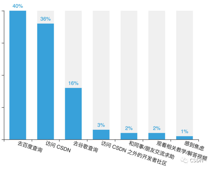 学会解决工作或学习中遇到的问题也是程序员必备技能之一。数据显示,近四成开发者遇到问题后会去百度查询解决方案,其次还有 36% 的开发者选择前往 CSDN 寻求帮助。