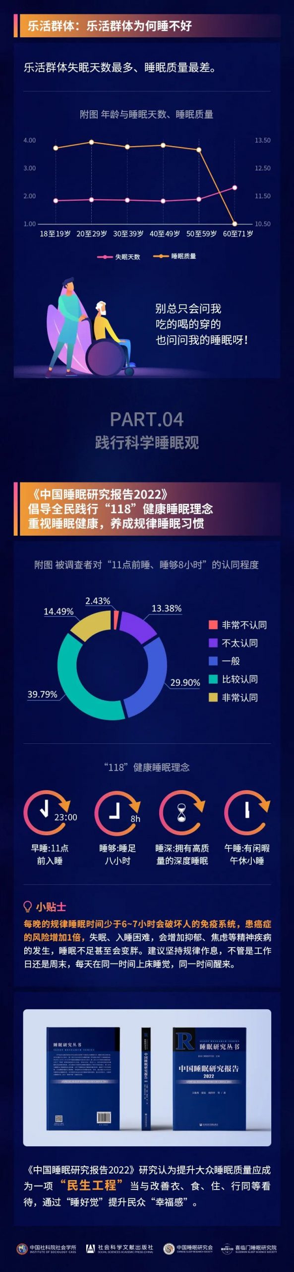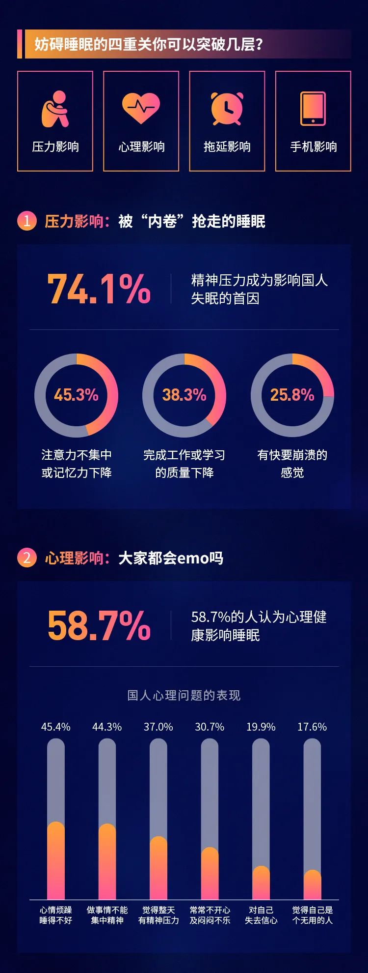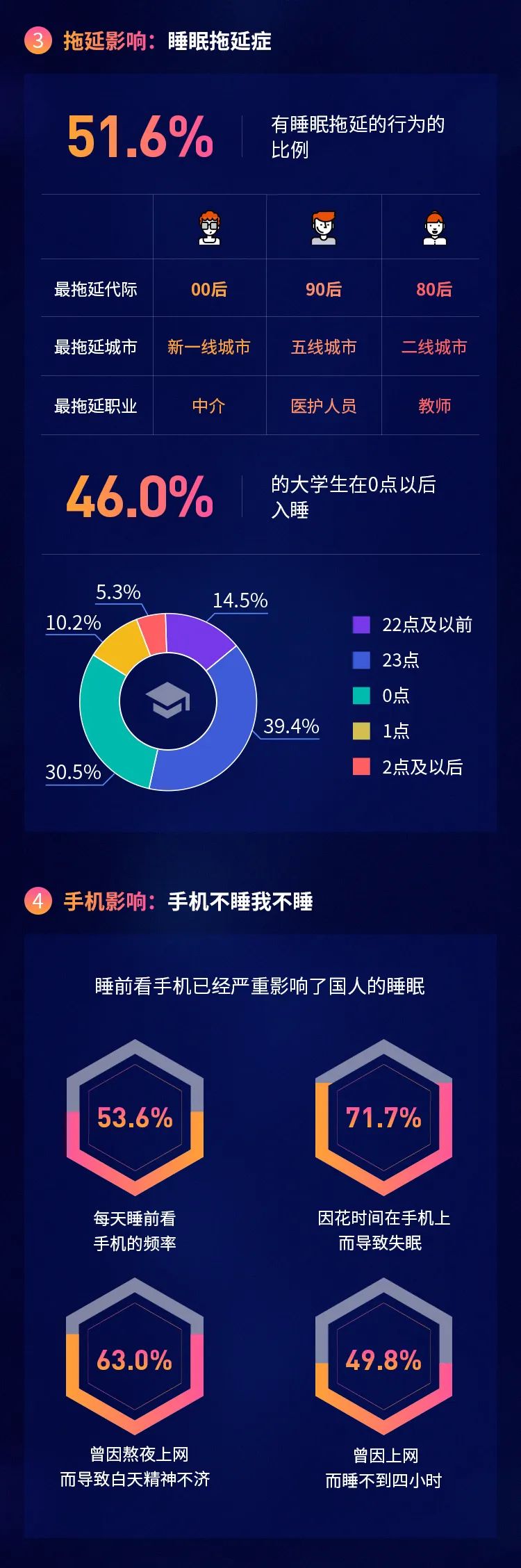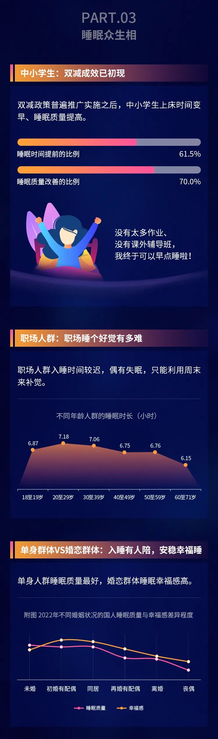 报告同时显示,10年间,国人睡得越来越晚、起得越来越晚,睡觉时间也越来越少。国人睡眠平均时长从2012年的8.5小时缩减到2021年的7.06小时,入睡时间晚了2个多小时,起床时间也晚了37分钟,睡觉时长减少近1.5小时。64.75%的被调查者每天实际睡眠时长不足8个小时。影响睡眠时长的因素包括看手机或上网导致睡眠拖延,工作或学习时长挤占了睡眠时间,以及失眠等睡眠障碍的影响。