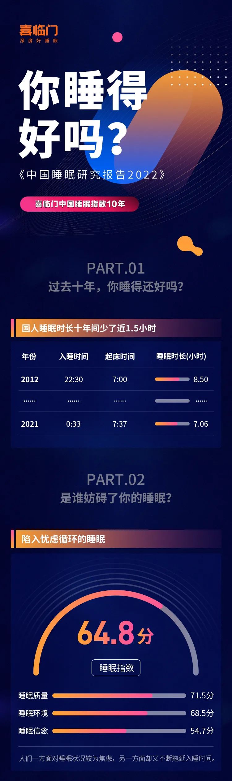 《中国睡眠研究报告2022》是喜临门连续9年发布的《中国睡眠指数报告》全新升级,通过构建睡眠指数分析居民的睡眠状况,主要从睡眠质量、睡眠信念和行为以及睡眠环境三个维度测量。报告结果显示,睡眠指数得分为64.78分(百分制),略高于及格线。睡眠信念和行为指标为54.73分,反映出人们对睡眠状况的担心,对失眠等睡眠问题的认识不足以及对入睡时间的拖延。