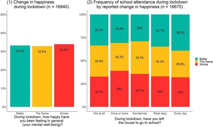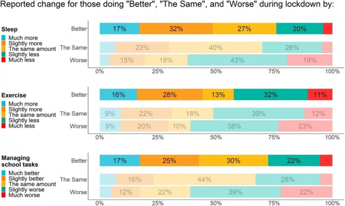 研究小组发现,有三分之一的学生认为他们的心理健康在第一次封锁期间有所改善。事实上,几乎相同数量的学生属于三个类别:他们的心理健康得到了改善;没有变化;或者他们的健康状况恶化了。