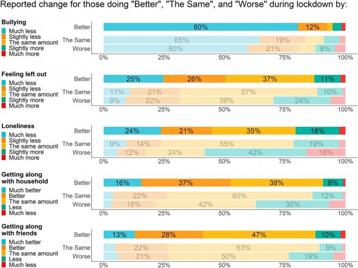 与同龄人相比,那些认为自己在封锁期间有较好幸福感的学生更有可能报告学校、家庭、人际关系和生活方式方面的积极封锁经验。例如,与同龄人相比,有更大比例的学生报告说,与封锁前相比,在封锁期间,欺凌行为减少