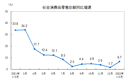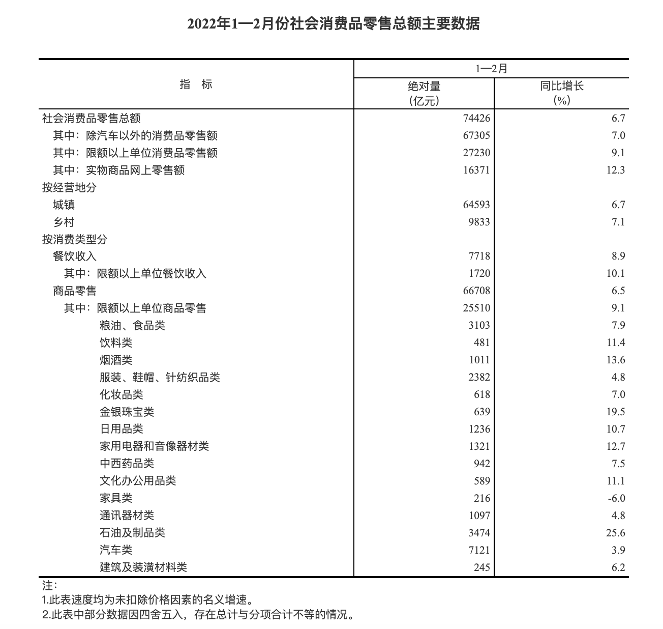 1—2月份,社会消费品零售总额74426亿元,同比增长6.7%。其中,除汽车以外的消费品零售额67305亿元,增长7.0%。扣除价格因素,1—2月份社会消费品零售总额同比实际增长4.9%。