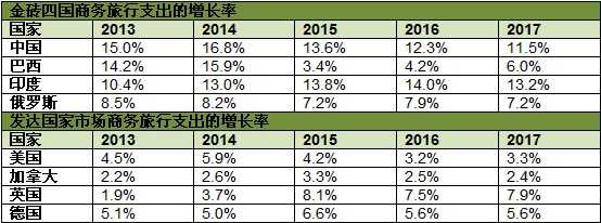 相比发达国家,金砖四国的商务旅行支出的增速更快