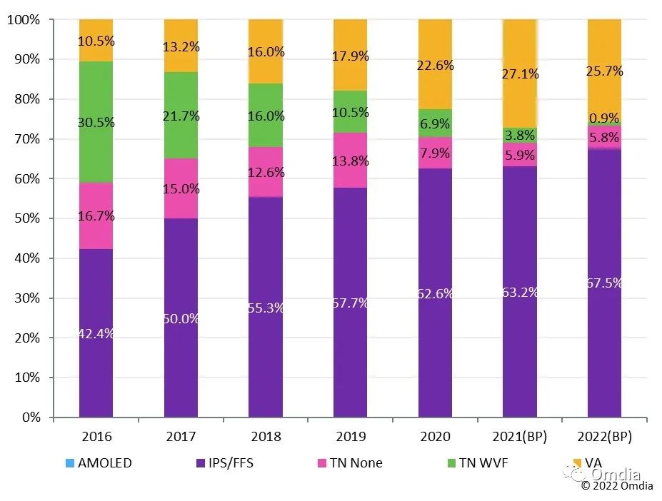 在2020年和2021年,VA技术继续增长,因为一些桌上型显示器品牌商和OEM厂商在入门级和小尺寸液晶显示器市场使用VA来取代TN型号。
