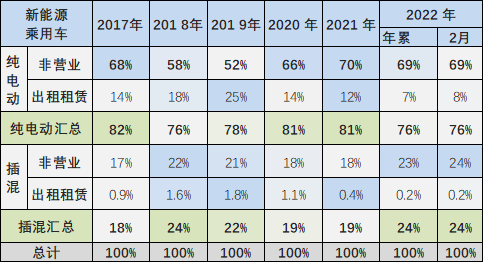 2017-2019 年的新能源乘用车的出租租赁类占比逐步提升。纯电动 2020 年出租租赁的占比相对 2019 年同期稍有下降。纯电动 2022 年 2 月出租租赁的占比在 8% 的低位。插混的私家车市场占比也是持续提升,出租租赁的插混需求持续下降。