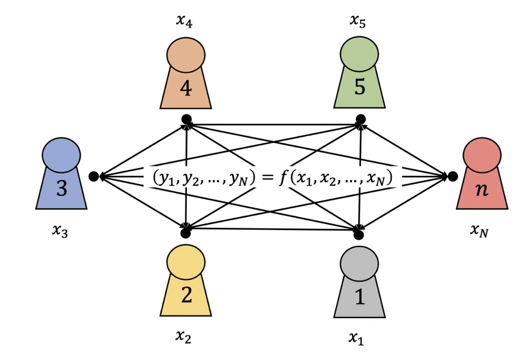 MPC是密码学中的定义,在无可信计算方的情况下,多个参与方各自持有秘密输入,并可完成对某个函数的计算,但每个参与方最终只能得到计算结果和能从自己输入和计算结果中推出的信息,其他信息均可得到保护。安全多方计算的定义可以通过下图描述。