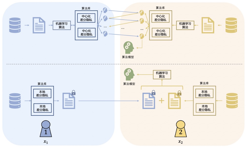 联邦学习是一种多个参与方在保证各自原始私有数据不出数据方定义的私有边界的前提下,协作完成某项机器学习任务的机器学习模式。根据隐私安全诉求与训练效率的不同,可以通过MPC、同态加密(Homomorphic Encryption,HE)、差分隐私(定义见下)等多种方式实现联邦学习。