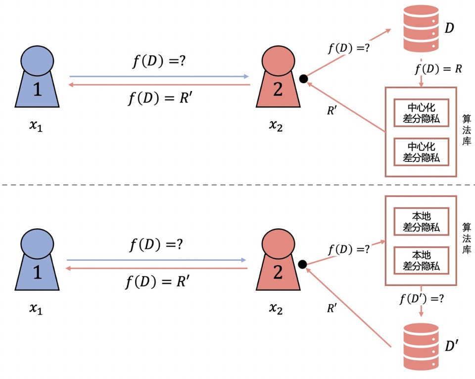 DP是一种基于对数据引入随机扰动,并从理论层面度量随机扰动所带来的隐私保护程度的隐私保护方法。根据随机扰动方式的不同,DP分为在原始数据层面进行随机扰动的本地差分隐私(Local Differential Privacy,LDP)和在计算结果层面进行随机扰动的中心差分隐私(Central Differential Privacy,CDP)。