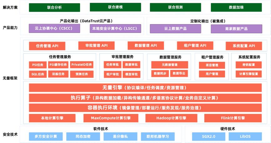 - 安全技术:底层基于不同类型的隐私计算技术,包括多方安全计算、同态加密、差分隐私、联邦学习等软件相关安全技术,以及SGX2.0等硬件相关安全技术;