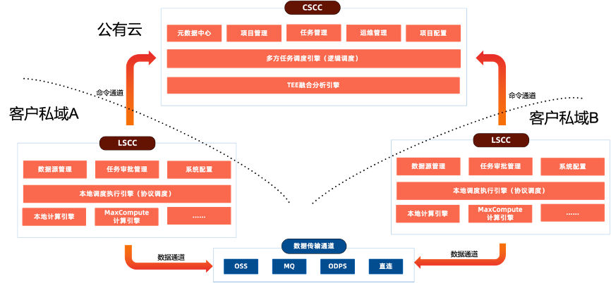 - 云上安全协调中心(Cloud Security Coordination Center,简称CSCC):以SaaS化服务部署在阿里云公有云或专有云,亦可独立化部署在客户私网环境,承担LSCC之间的任务协调调度、任务下发等协调性工作,同时还提供中心化的数据安全计算能力(即TEE可信执行环境)。